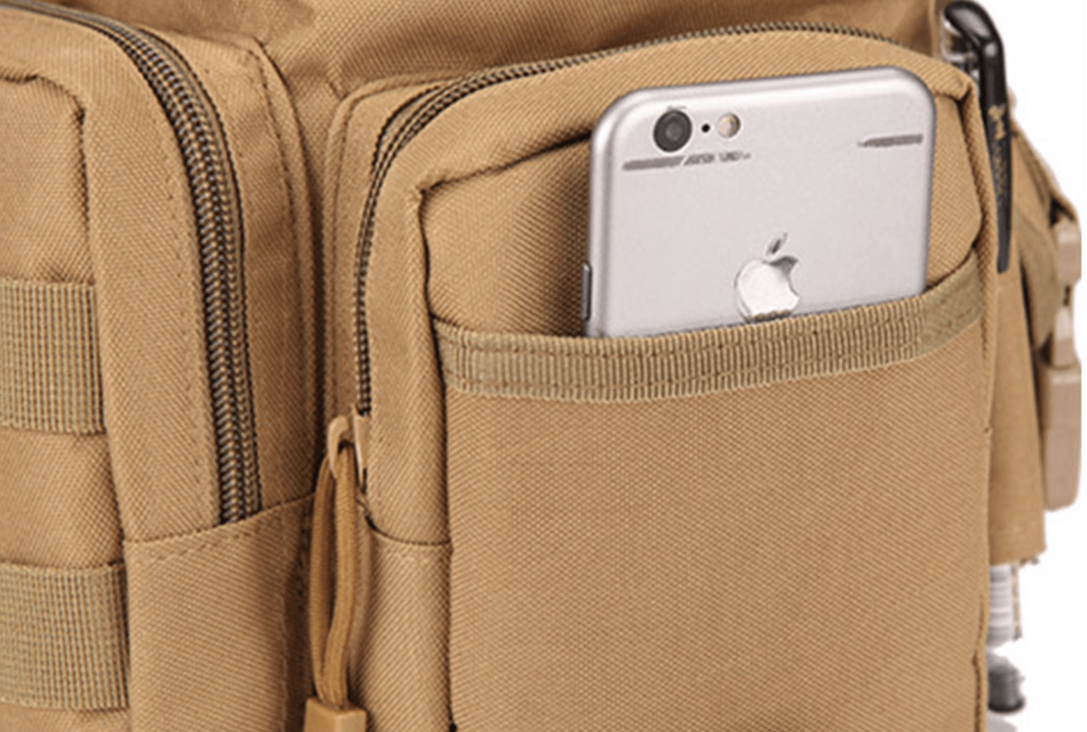 Close-up of waterproof nylon material on a tactical thigh bag, highlighting zippers & stitching
